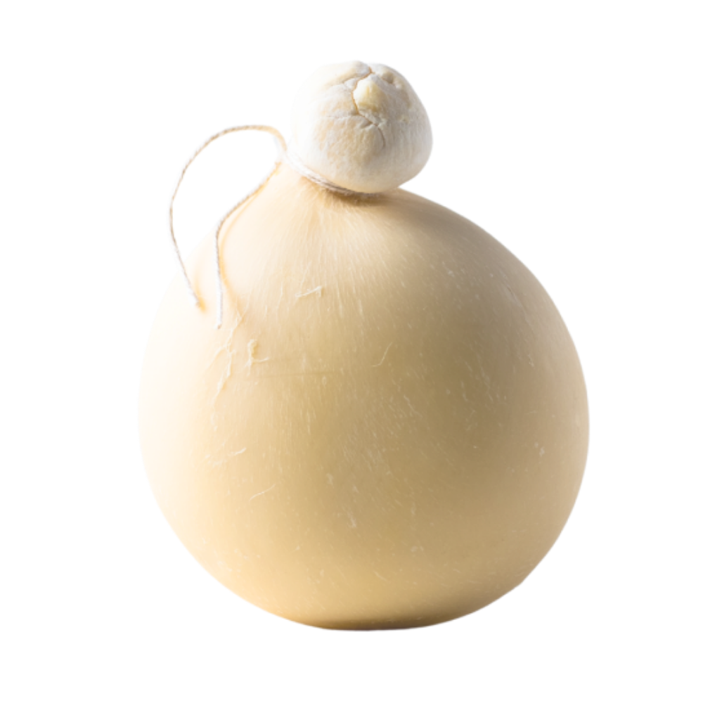 This aged mozzarella is made from cow milk and hand-stretched into a natural tear drop shape to be hung to age.